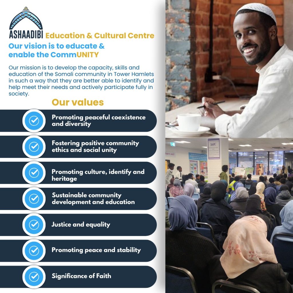Ashaadibi aims to support disadvantaged BAME Tower Hamlets residents, to become independent and socially included, in particular, we focus on supporting the needs of the Muslim community and promoting social cohesion within the wider community.